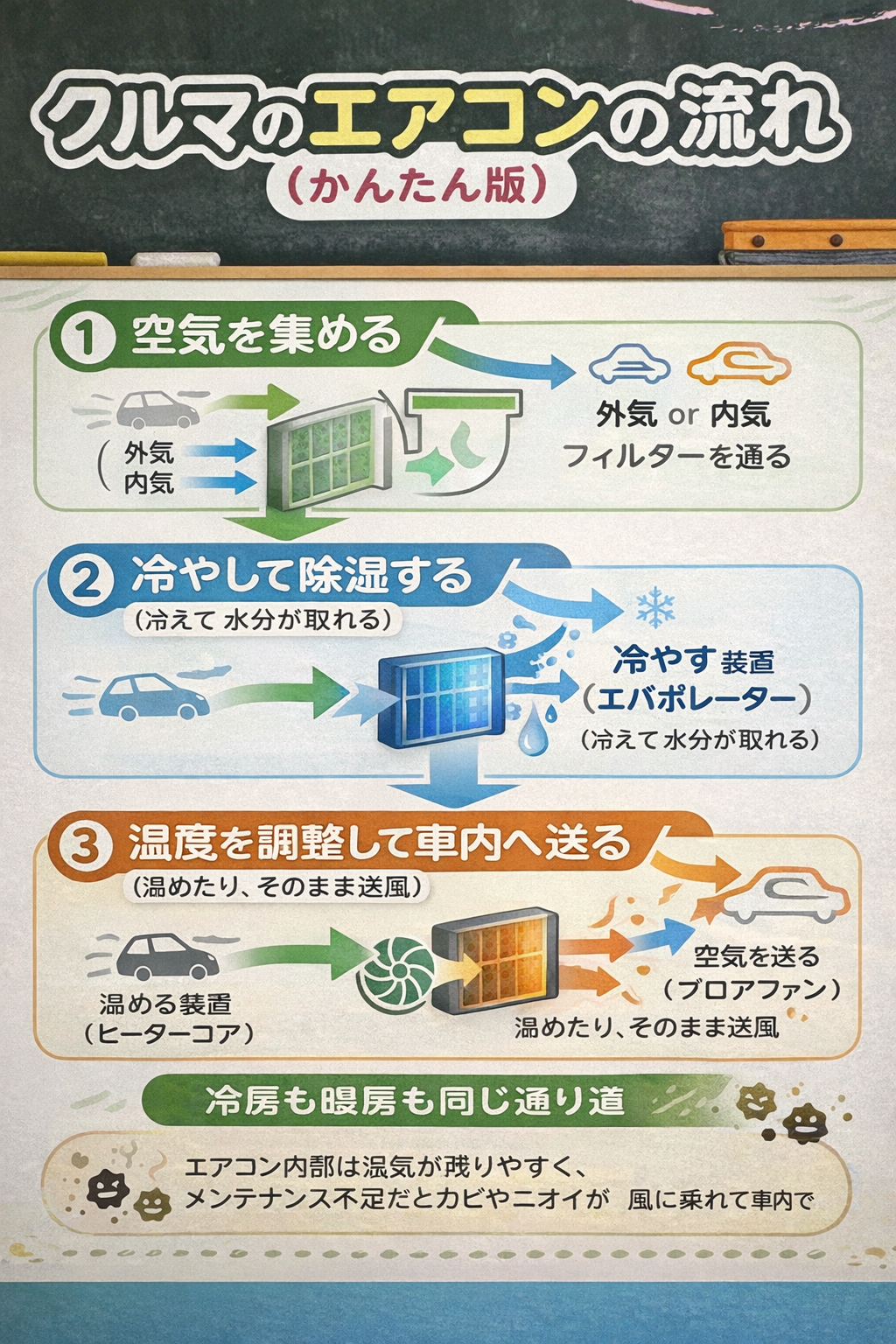 ・普段からできる予防策で、目的地到着の5分ほど前に「エアコンオフ・送風MAX」にするとカビ予防になります。